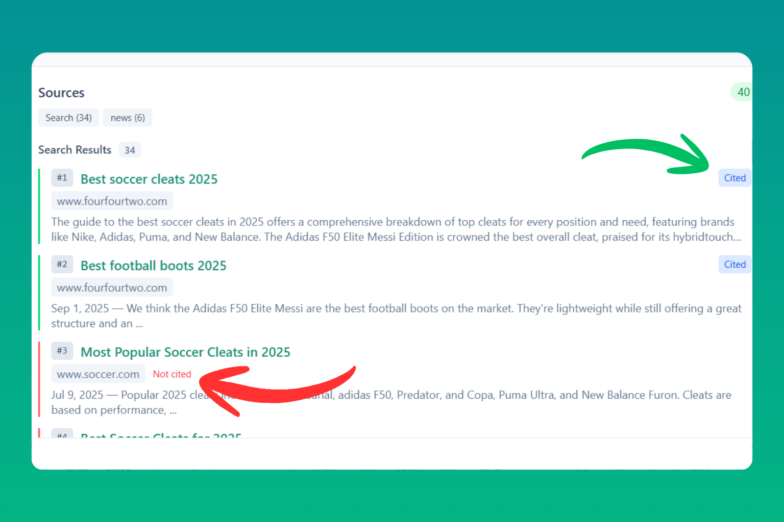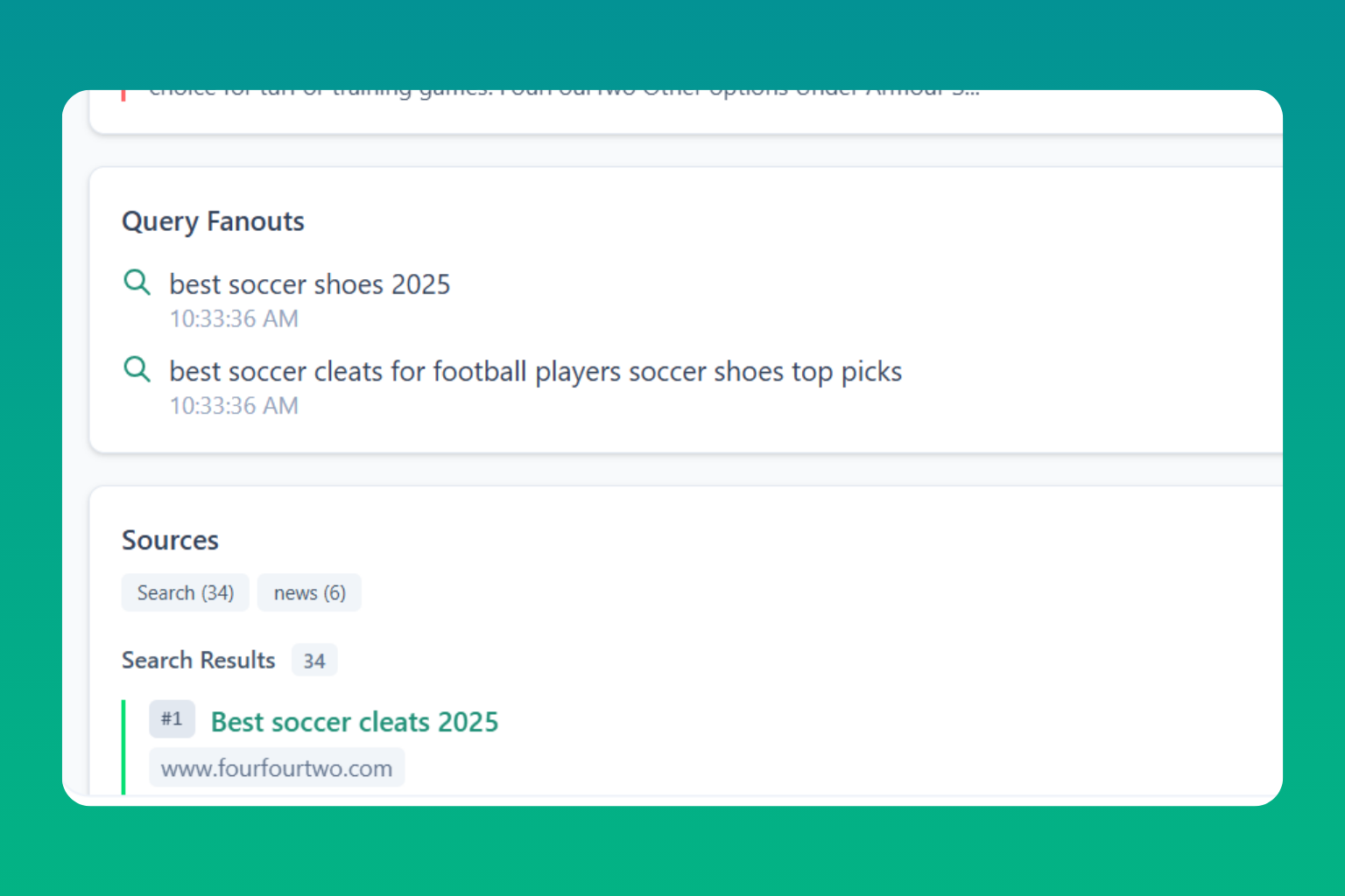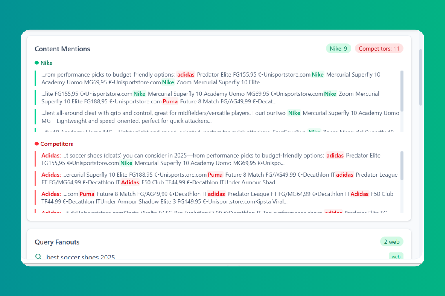 See exactly where your brand and competitors appear for each AI fanout query - including source positions, not just presence.